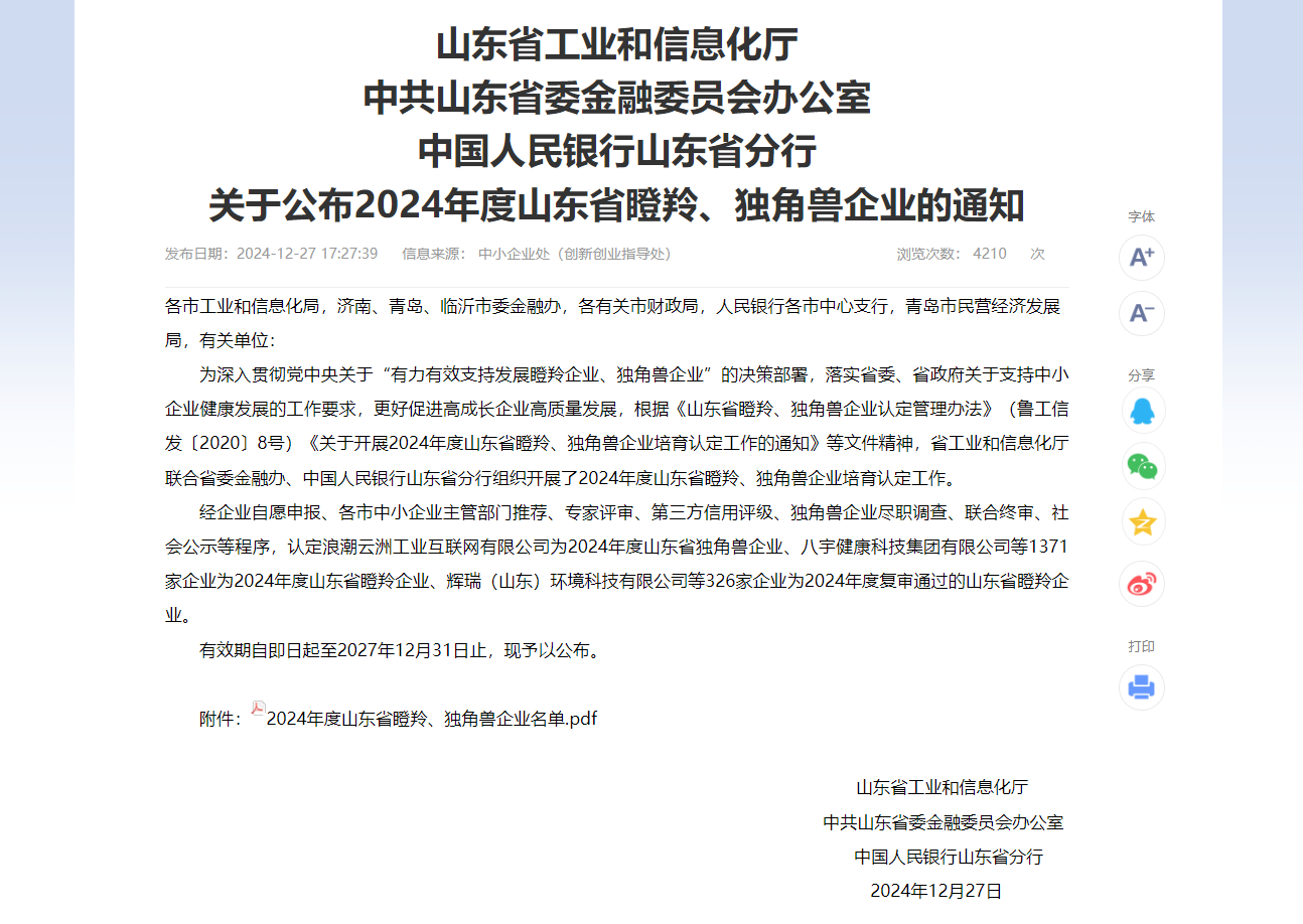 近日,山東省工業(yè)和信息化廳、中共山東省委金融委員會辦公室、中國人民銀行山東省分行公布2024年度山東省瞪羚、獨角獸企業(yè)名單。和普威視成功入選。